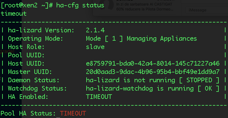 i would try restarting the toolstack on the master. if ha-cfg status on the slave no longer reports timeout, the problem has cleared