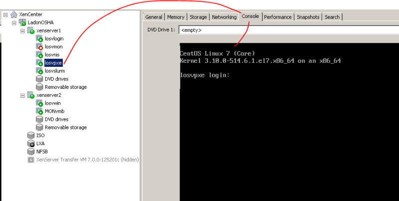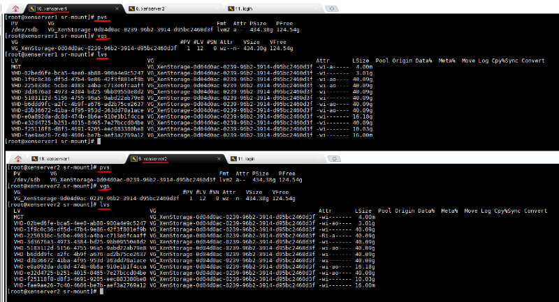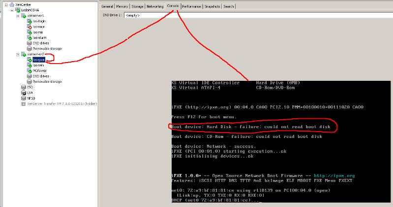 If I shutdown the VM on xenserver1 and if I start it on xenserver2, you can read that there's no hard disk to boot for that machine.