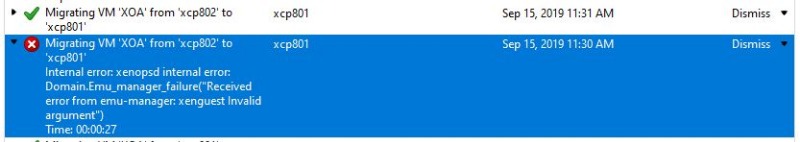 Issue: live migration from pool master to the slave host results on unresponsive VM, that ends up rebooting itself after an Error Event like this: "Internal error: xenopsd internal error: Domain.Emu_manager_failure('Received error from emu-manager: xenguest Invalid argument')"