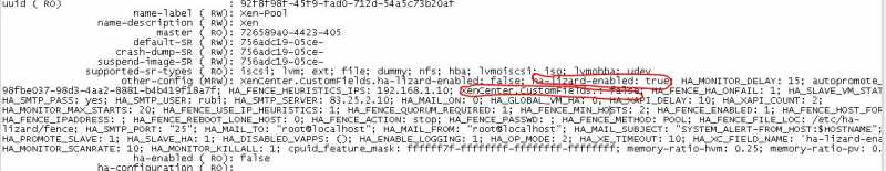 other-config (MRW): XenCenter.CustomFields.ha-lizard-enabled: false; ha-lizard-enabled: true; HA_MONITOR_DELAY: 15; autopromote_uuid: 98fbe037-98d3-4aa2-8881-b4b419f18a7f; HA_FENCE_HEURISTICS_IPS: 192.168.1.10; XenCenter.CustomFields.: false; HA_FENCE_HA_ONFAIL: 1; HA_SLAVE_VM_STAT: 1; HA_SMTP_PASS: yes; HA_SMTP_USER: rubi; HA_SMTP_SERVER: 83.25.2.10; HA_MAIL_ON: 0; HA_GLOBAL_VM_HA: 0; HA_XAPI_DELAY: 10; HA_XAPI_COUNT: 2; HA_MONITOR_MAX_STARTS: 20; HA_FENCE_USE_IP_HEURISTICS: 1; HA_FENCE_QUORUM_REQUIRED: 1; HA_FENCE_MIN_HOSTS: 2; HA_FENCE_ENABLED: 1; HA_FENCE_HOST_FORGET: 0; HA_FENCE_IPADDRESS: ; HA_FENCE_REBOOT_LONE_HOST: 0; HA_FENCE_ACTION: stop; HA_FENCE_PASSWD: ; HA_FENCE_METHOD: POOL; HA_FENCE_FILE_LOC: /etc/ha-lizard/fence; HA_SMTP_PORT: "25"; HA_MAIL_TO: "root@localhost"; HA_MAIL_FROM: "root@localhost"; HA_MAIL_SUBJECT: "SYSTEM_ALERT-FROM_HOST:$HOSTNAME"; HA_PROMOTE_SLAVE: 1; HA_SLAVE_HA: 1; HA_DISABLED_VAPPS: (); HA_ENABLE_LOGGING: 1; HA_OP_MODE: 2; HA_XE_TIMEOUT: 10; HA_XC_FIELD_NAME: 'ha-lizard-enabled'; HA_MONITOR_SCANRATE: 10; HA_MONITOR_KILLALL: 1; cpuid_feature_mask: ffffff7f-ffffffff-ffffffff-ffffffff; memory-ratio-hvm: 0.25; memory-ratio-pv: 0.25