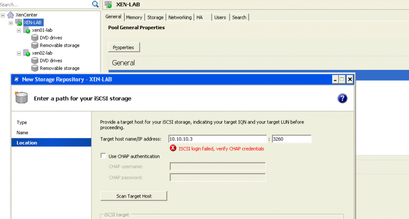 Apparently everything is fine, but when creating an iscsi storage, the message ISCSI LOGIN FAILED, VERIFY CHAP CREDENTIALS appears.